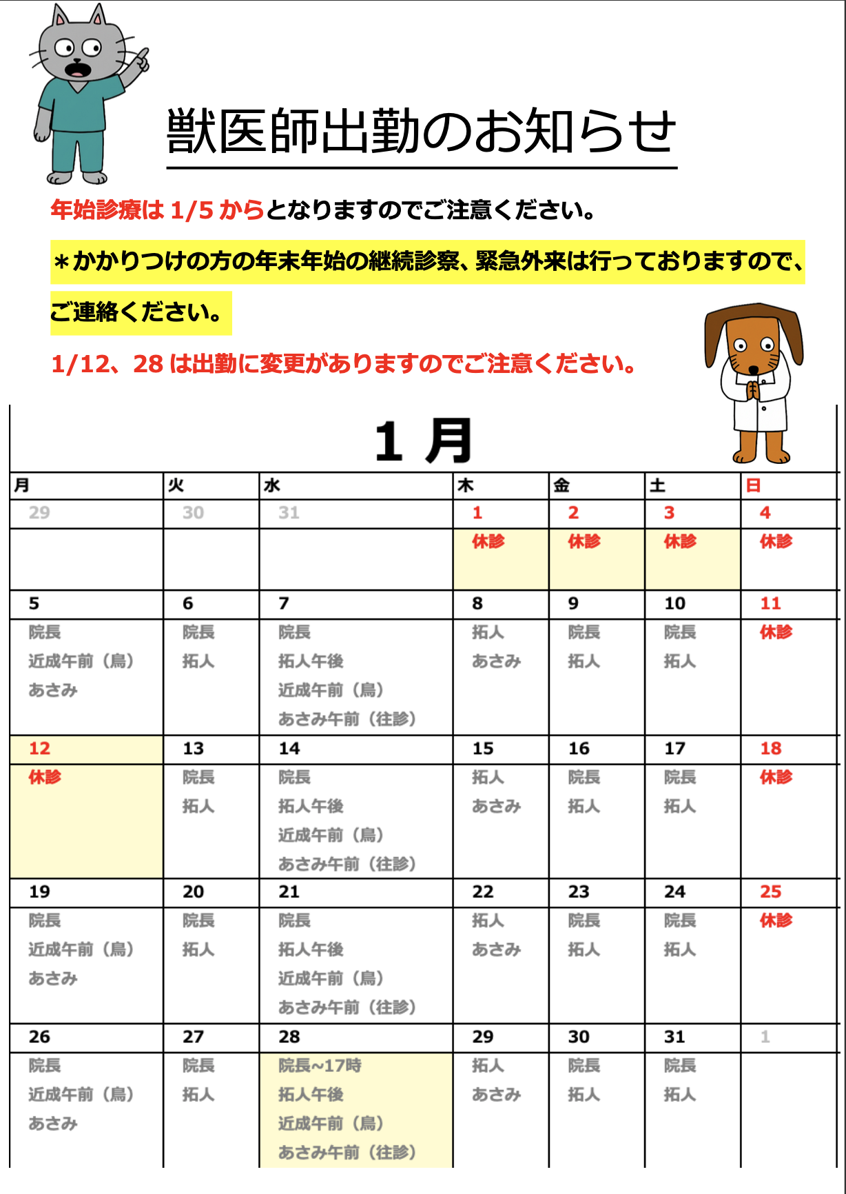 1月の獣医師出勤表になります。