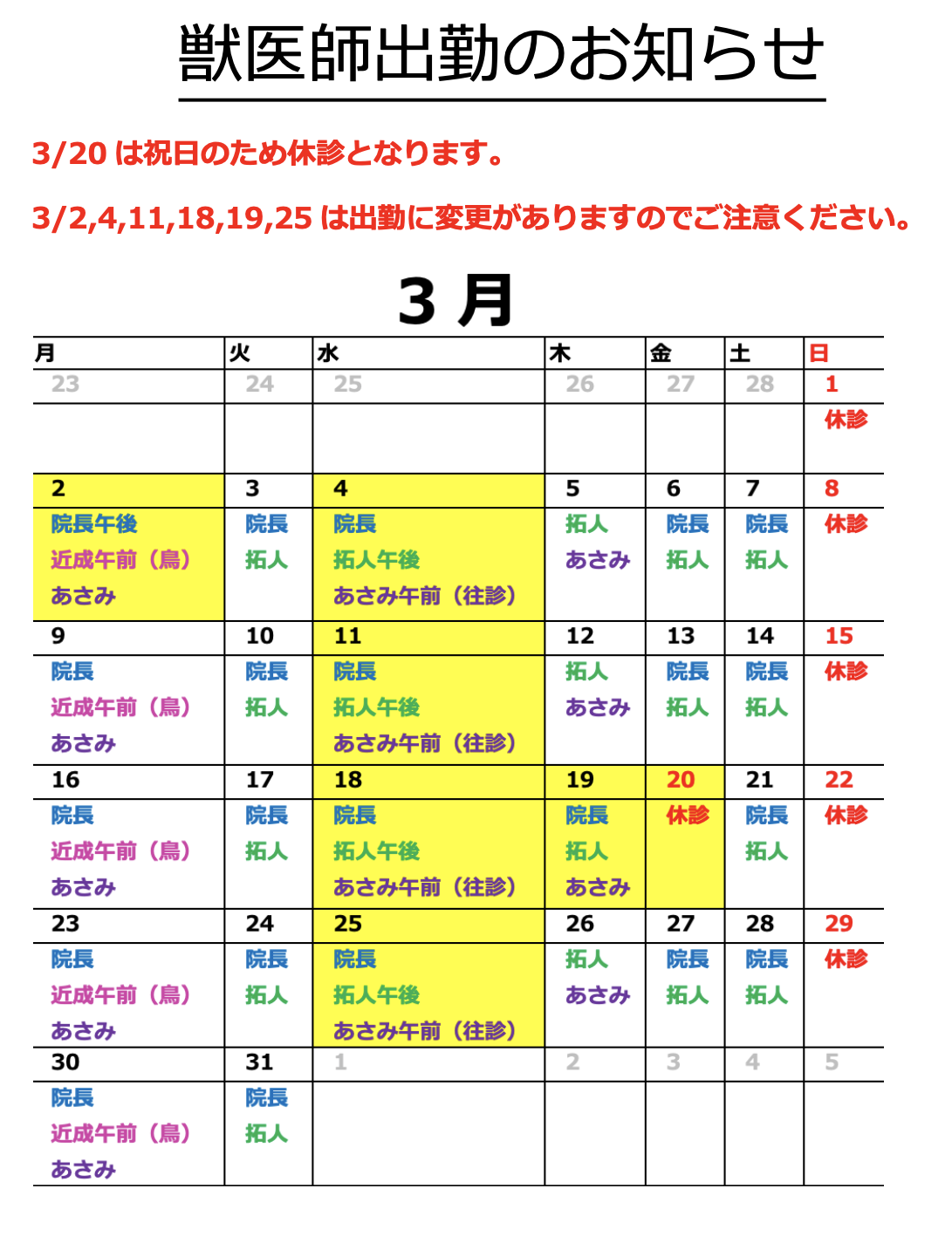 3月の獣医師出勤表になります。
