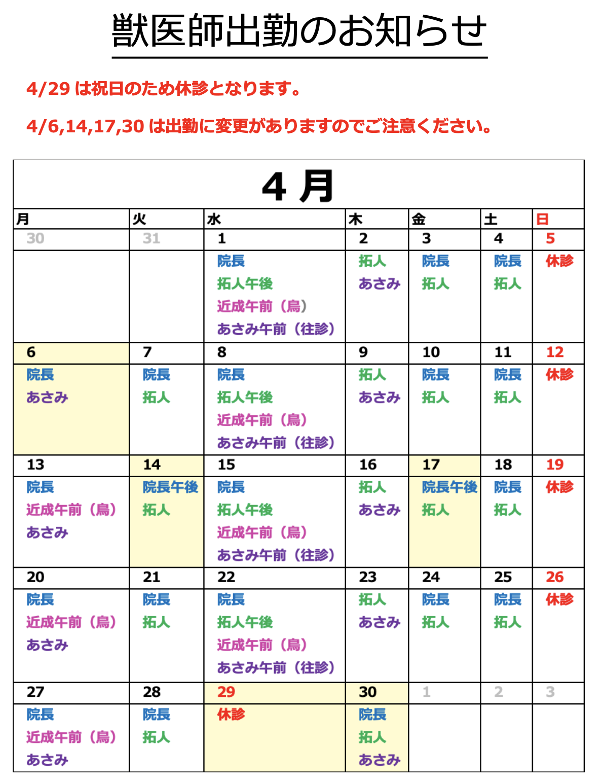 4月の獣医師出勤表になります。